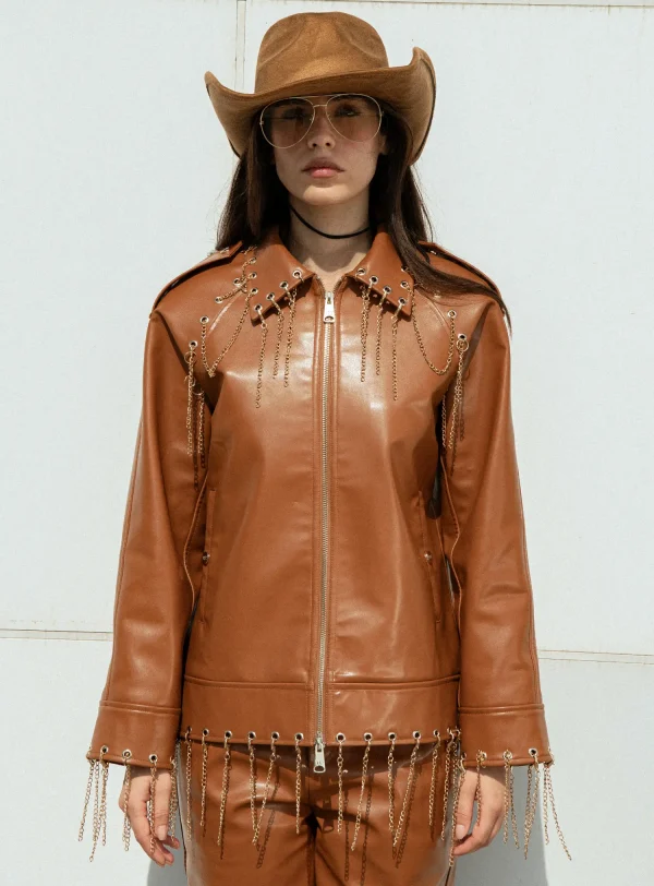 Falling gold chains around neck, shoulders,armholes and jacket hem.